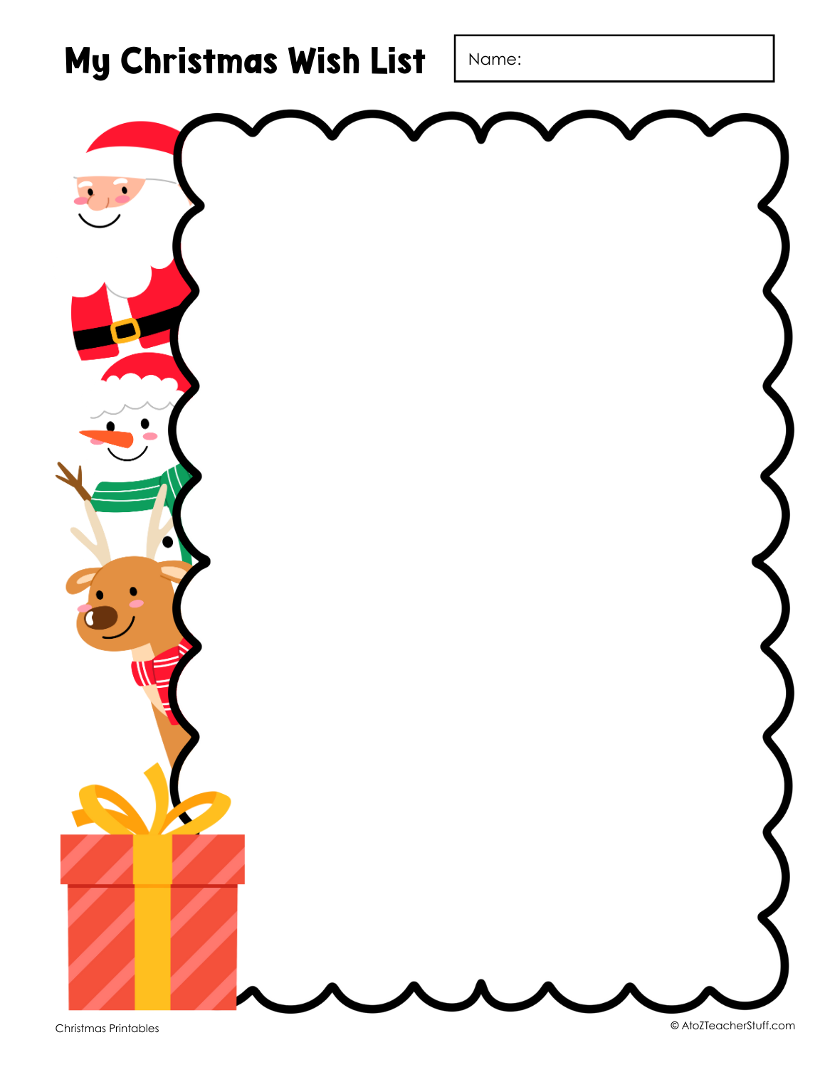 This Christmas Wish List printable page gives children a simple place to write or draw the things they’re hoping for this Christmas. The left side features Santa, an elf, a snowman, and a reindeer, with a wrapped present at the bottom. The center area is open for kids make their list. Easy to print and use for classroom writing activities or at home. (Updated version 2025).